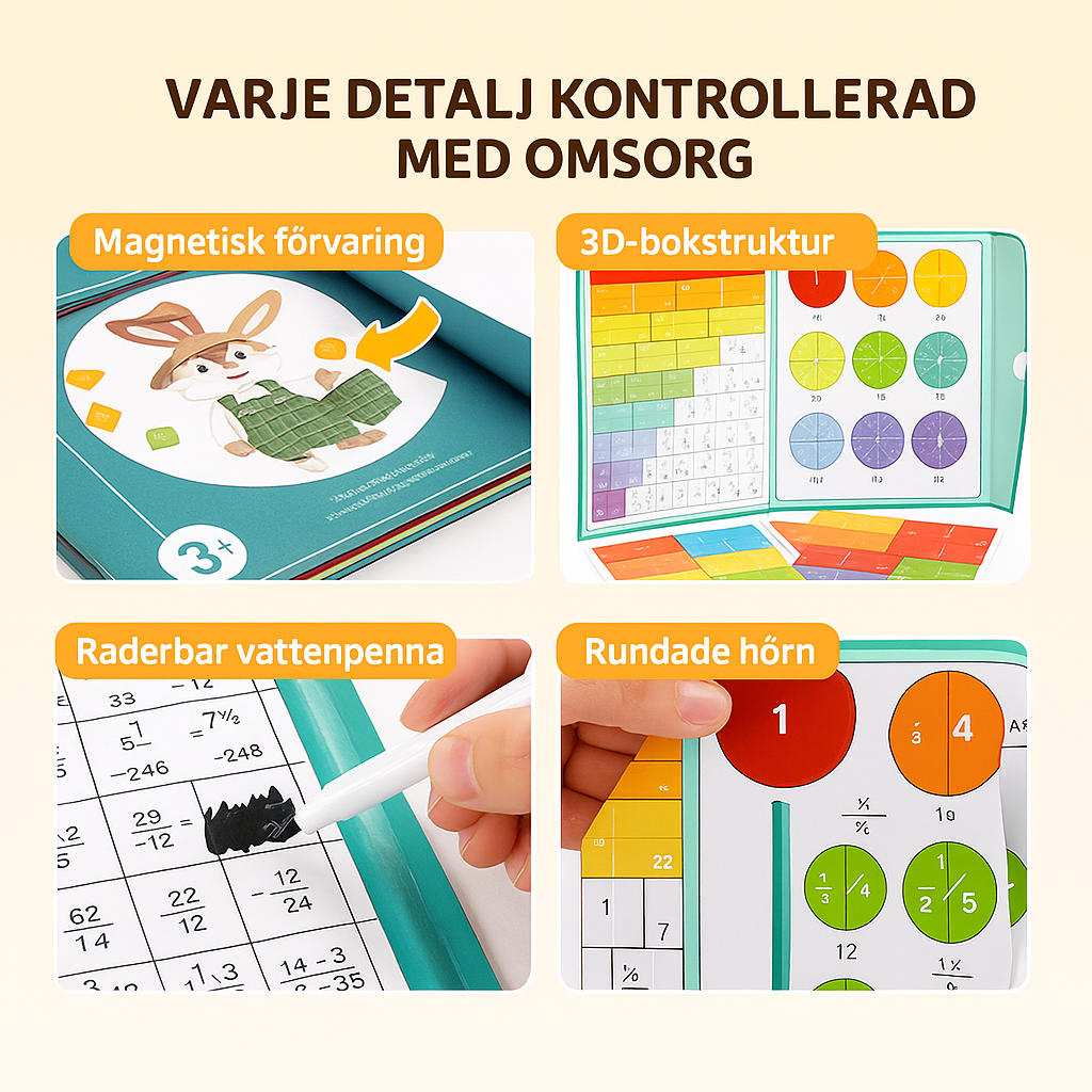 Den vikbara 3D-boken har inbyggd magnetförvaring och rundade hörn för trygg användning. Slitstarka bitar och en suddbar vattenpenna gör att övningar kan upprepas om och om igen. Materialen är BPA-fria och godkända för barn – perfekt hemma, i skolan eller på resan.