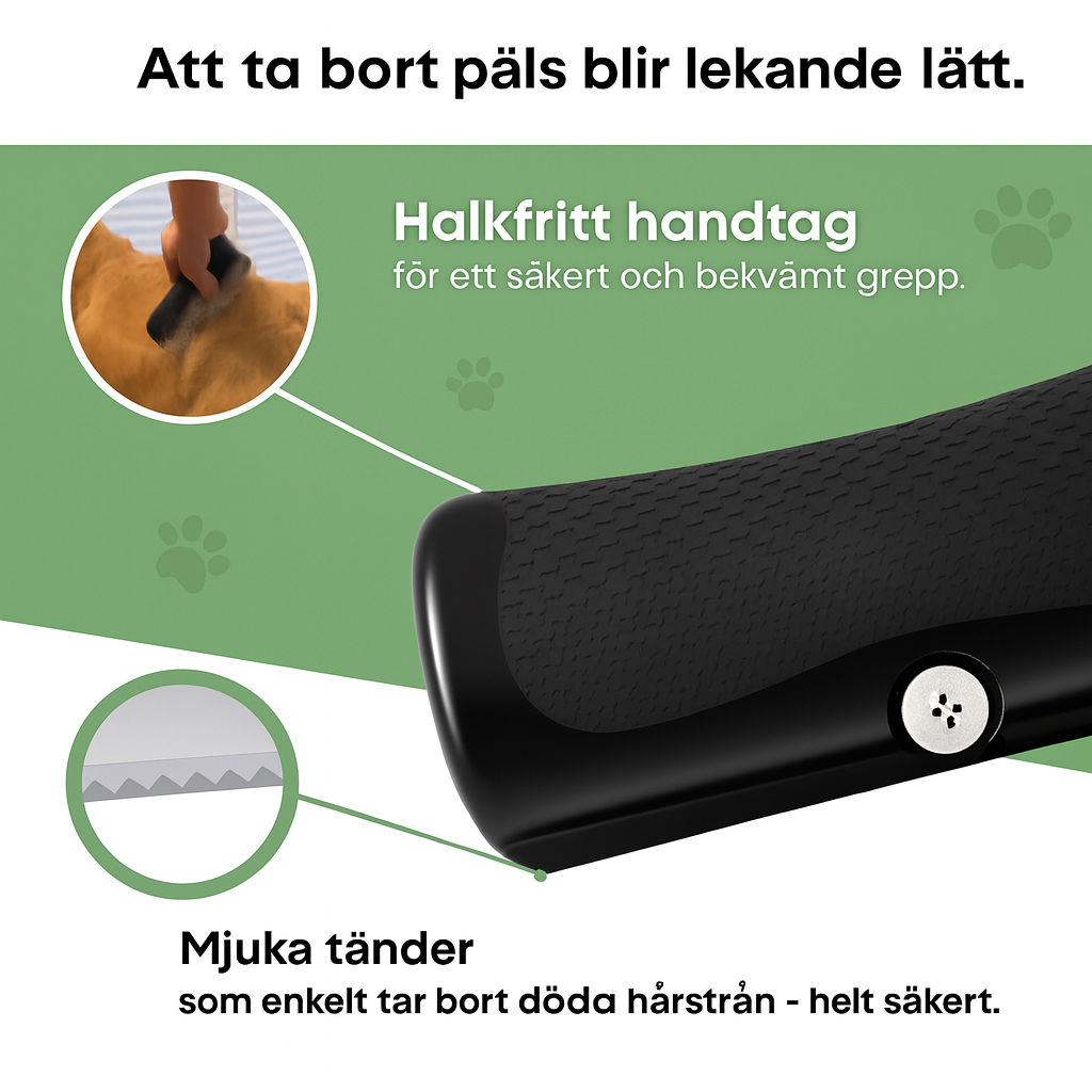 Den ergonomiska designen ger säkert grepp och full kontroll, även när hunden rör sig eller har tät päls. Tänderna glider utan att dra eller slita, vilket gör borstningen behaglig även för känsliga hundar. Använd cirka tre gånger i veckan för minskad mängd lösa hår och en frisk, välmående päls.